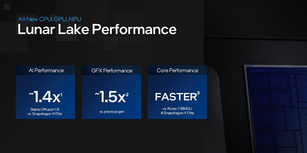 按照官方给出的数字,Lunar Lake CPU性能可超过AMD锐龙7 8840U、骁龙X Elite,GPU性能比上代提升约1.5倍,AI性能相比于骁龙X Elite可以领先大约1.4倍。