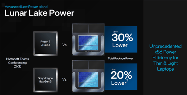 还有超低功耗,这也将是Lunar Lake的拿手好戏,官方宣称在视频会议场景中,相比锐龙7 7840U可节省最多30%的功耗,而相比骁龙8cx Gen3可以低最多20%。