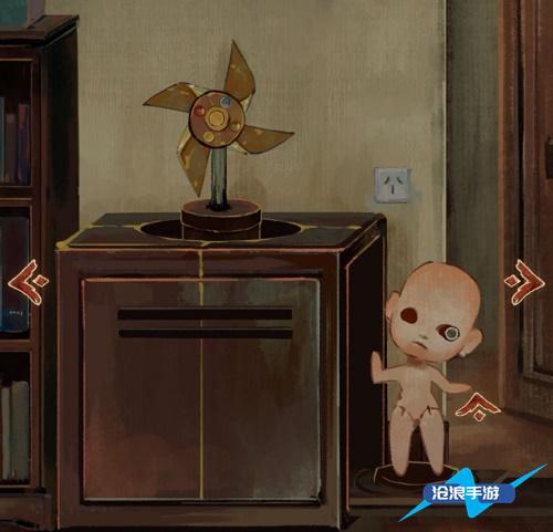 7、将神兽的翅膀放入屋中另一个神兽身上,神兽下落上升一个风车,将获取的四个球形装置和一个奇怪的装置放入风车中,出现一个娃娃点击他的眼睛,收集一个奇怪的装置。