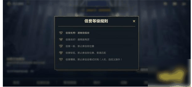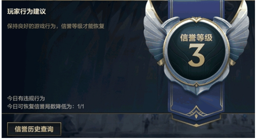 信誉等级是评估玩家当前账号表现的重要指标,信誉等级优秀的玩家可以自由体验游戏。信誉等级降低至3级将被禁止参加排位赛,降低至2级将无法参与匹配和排位,降低至1级时只能进行自定义以及人机对局了。