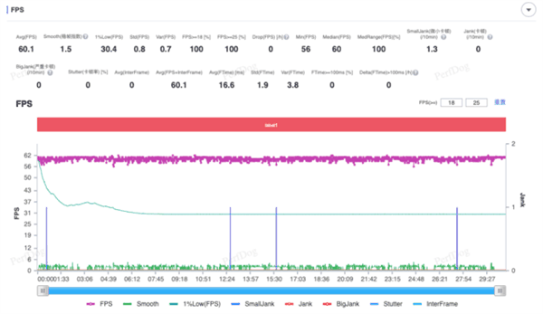 在《原神》这一堪称手机性能检测器的游戏中,iQOO Neo9S Pro展现了其非凡的游戏性能。开启最高画质与60帧模式后,30分钟的测试结果显示,平均帧率几乎维持在满帧状态,且帧率曲线异常平稳。