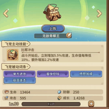 弩手pve飞宠首选:无敌青椰王在《冒险大作战》中,对于弩手玩家来说,一个强力的pve飞宠至关重要。叮当号香蕉强烈推荐无敌青椰王,它不仅能提供高额攻速加成,还拥有独特的随生命值降低而提升攻速的特性。战斗伊始,青椰王便能为弩手提供5.5%的攻速加成,让玩家快速建立优势。随着战斗的深入,青椰王更是火力全开,每减少10%的生命值,便额外增加2.2%的攻速。这种逆境增益机制使得弩手在险境中也能保持强劲输出,成为pve战场上不可忽视的存在。