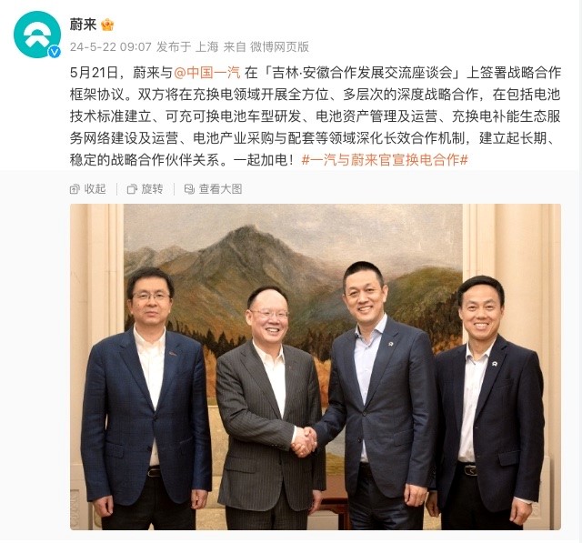 【科技号】5月22日消息,据官方消息,蔚来与中国一汽在日前签署了战略合作框架协议。