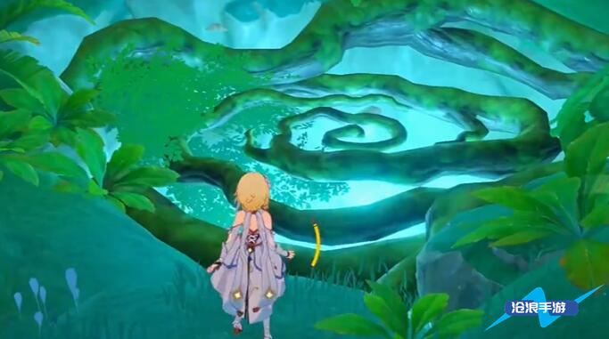 2、然后前往水天丛林,在上图东南北方向找到中间的大树洞。