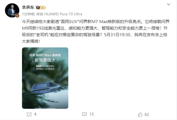 余承东表示,问界新M7 Max焕新版将搭载问界M9同款192线激光雷达,感知能力更强大,智驾能力和安全能力更上一层楼!