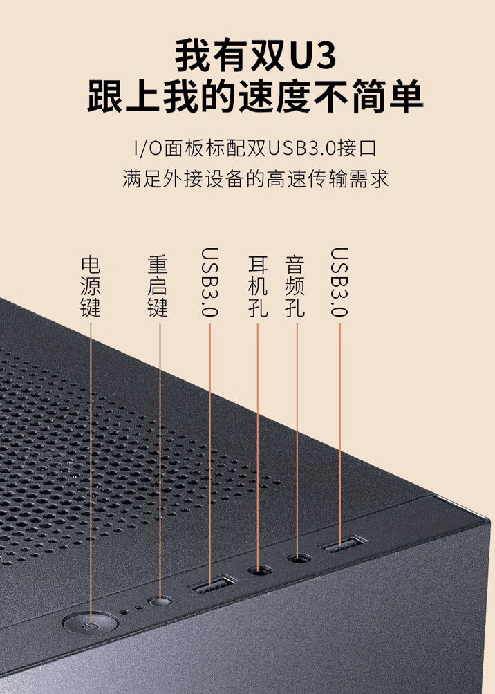 接口方面,这款机箱顶置2个 USB-A 3.0接口、2 个 3.5mm音频接口。