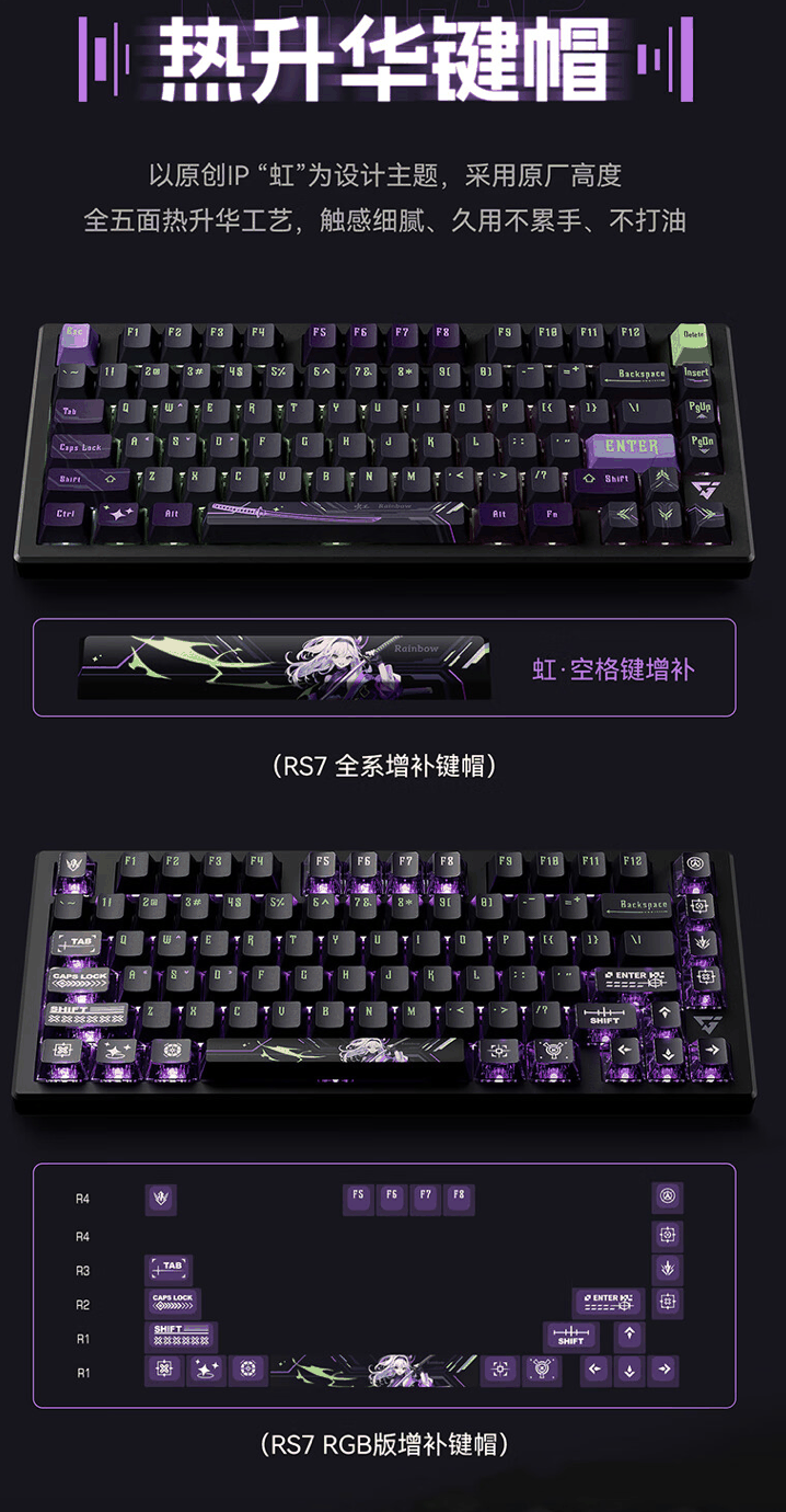 这款键盘键帽以原创 IP“虹”为设计主题,采用原厂高度,全五面热升华工艺,使用“佳达隆磁玉轴-紫色限定版”轴体,可调节精度 0.02mm,RT 调节范围 0.02~3.4mm,可调节 0 死区,卫星轴为 ATK V1 卫星轴。