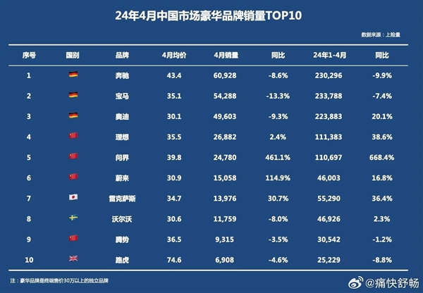 第六至第十名则分别为蔚来(4月均价30.9万元)、雷克萨斯(4月均价34.7万元)、沃尔沃(4月均价30.6万元)、腾势(4月均价36.5万元)和路虎(4月均价74.6万元),4月销量从数千辆到1.5万辆不等。