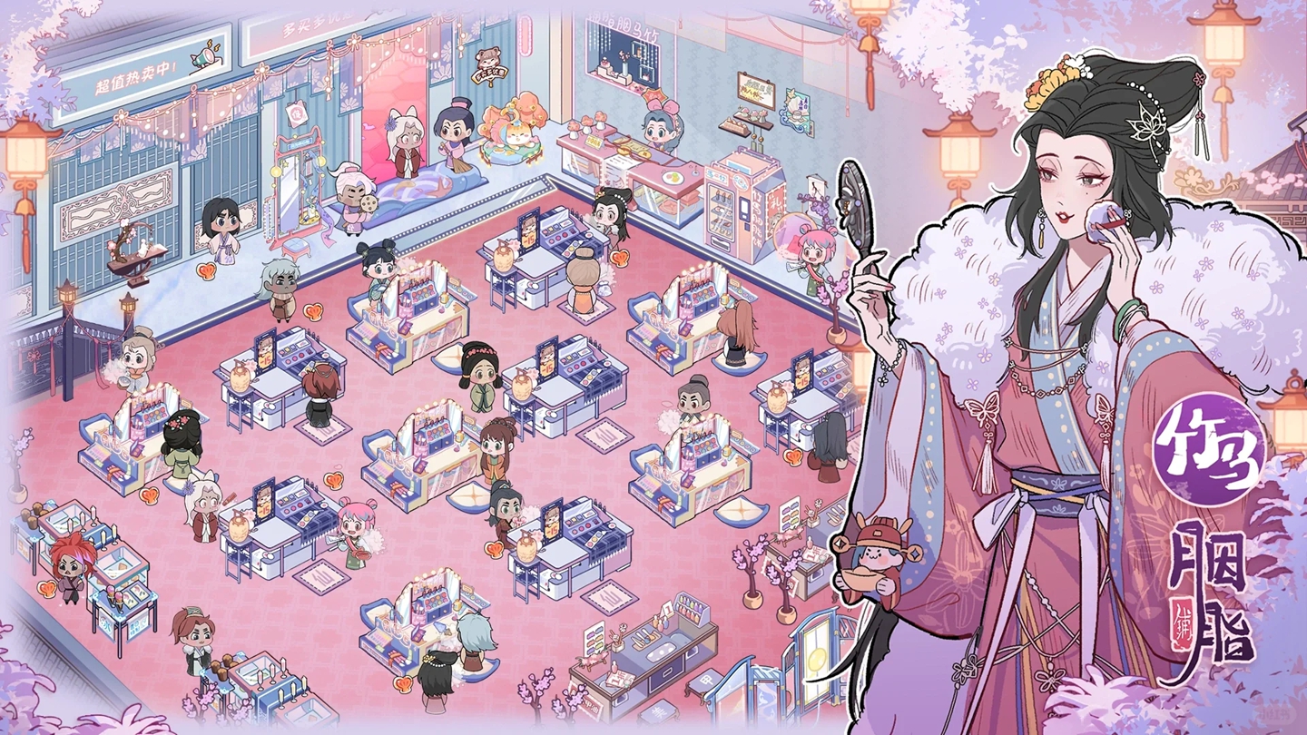 游戏核心玩法为模拟经营——“将胭脂铺做大做强”是玩家的核心目标。玩家需要合理分配资源、升级店铺外观,上架不同的商品用来满足顾客需要,招募店员、完成揽客、参与店铺评级则会带来更高的收益。