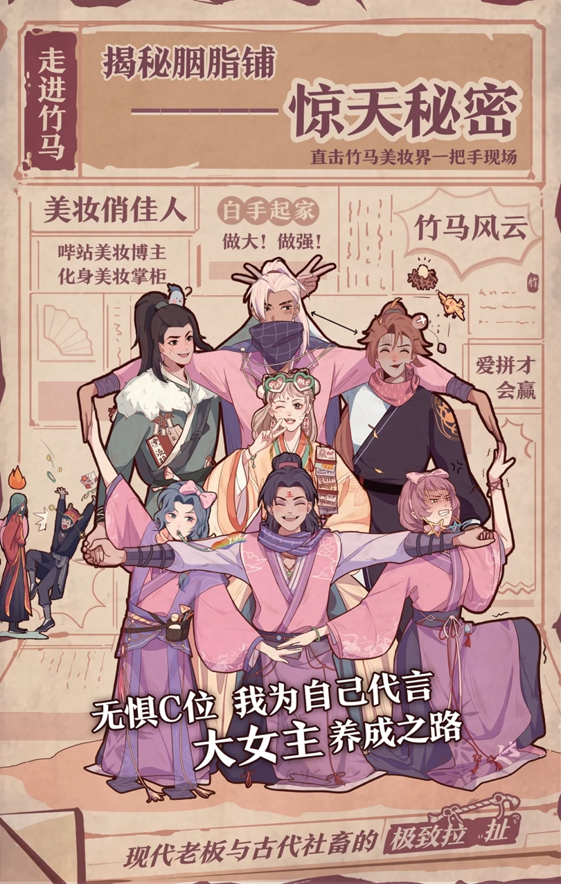 《竹马胭脂铺》是一款古风模拟经营美妆店铺的游戏。玩家将作为竹马县的新手掌柜,发展美妆事业,将竹马胭脂铺做大做强。期间大家还可以结识竹马县的县民们,与众文人雅士“称兄道弟”,体验轻松诙谐的市井生活。
