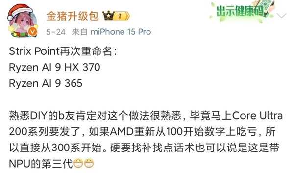 此前博主@金猪升级包曾曝出名称为Ryzen AI 9 HX 370和Ryzen AI 9 365的两款处理器,按照AMD以往的命名规则来说的话,前者的HX应该是高性能且能够超频的型号,主要是面向高端游戏本,而后者则是面向轻薄本以及主流游戏本的型号。