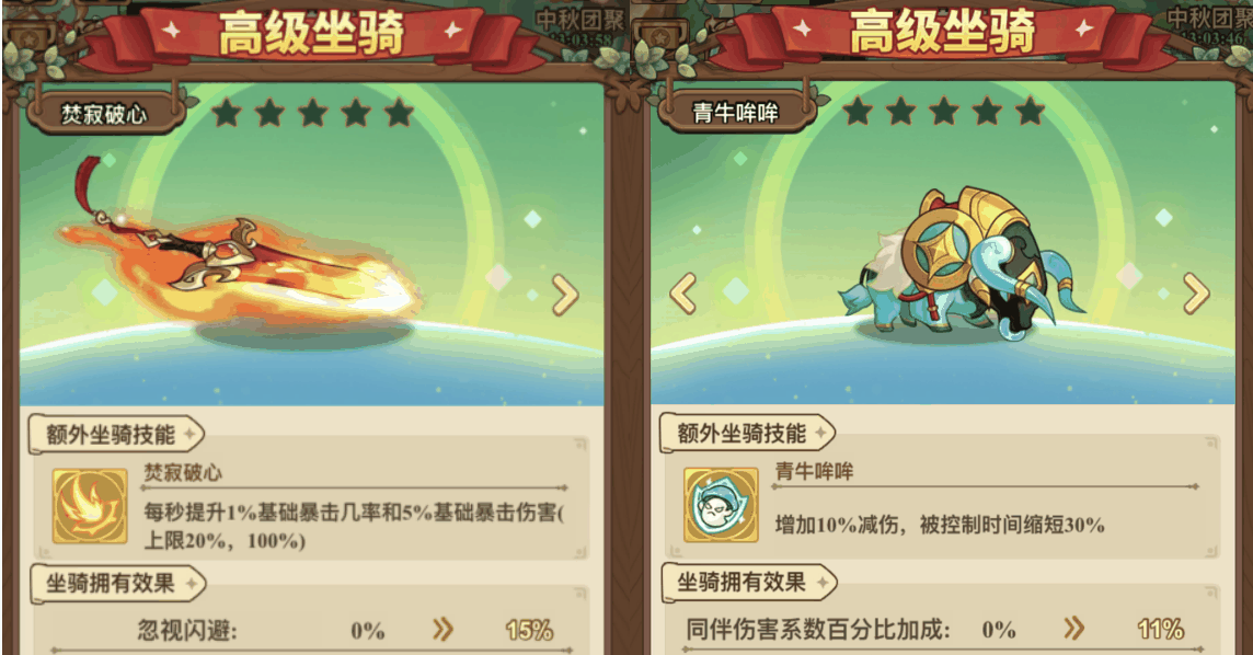 为了避免对手叠闪避躲避反击伤害,建议战士选择可以忽视闪避效果的高级坐骑焚寂破心。后期可以替换为增加10%减伤、减少被控时间的青牛哞哞。