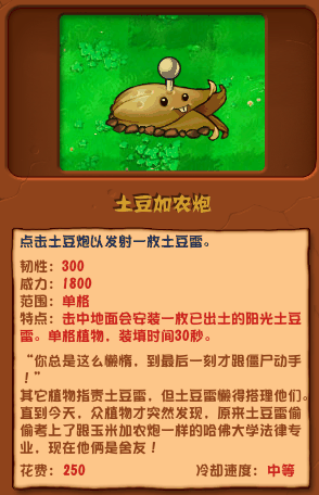 你总是这么懒惰,到最后一刻才跟僵尸动手其它植物指责土豆雷,但土豆雷懒得搭理他们直到今天,众植物才突然发现,原来土豆雷偷偷考上了跟玉米加农炮一样的哈佛大学法律专业,现在他俩是舍友!