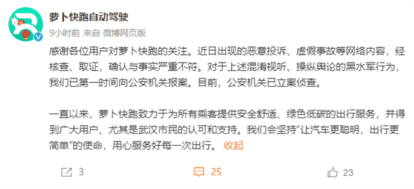 萝卜快跑表示,近日出现的恶意投诉、虚假事故等网络内容,经核查、取证,确认与事实严重不符。