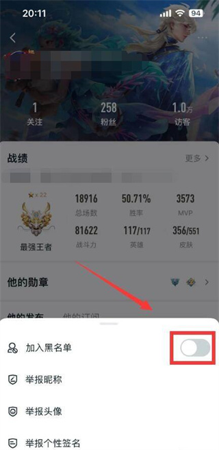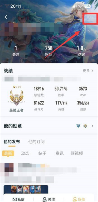 首先打开王者荣耀游戏,然后进入到软件中需要移除的粉丝的主页中,我们点击右上角的【三点图标】。