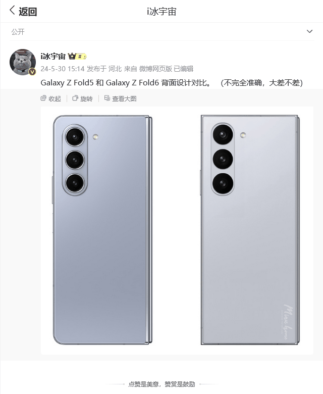 @i 冰宇宙今天还在微博上分享了 Galaxy Z Fold5 和 Galaxy Z Fold6 手机背面设计对比: