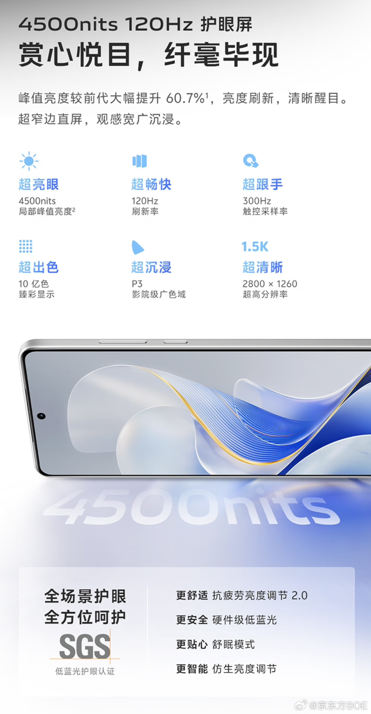 京东方宣布独供 vivo S19 及 S19 Pro 手机的屏幕。据介绍,该系列手机屏幕采用京东方新一代 Q9 发光器件,分辨率 2800 × 1260,亮度可达 4500nits,支持超高频 2160Hz PWM 调光和低蓝光护眼技术。同时,该系列手机屏幕支持 120Hz 多频刷新率模式,DCI-P3 色域值达105%,支持抗疲劳亮度调节、舒眠模式、仿生亮度调节。