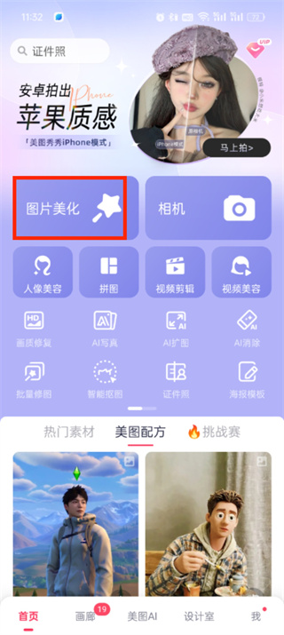 首先打开美图秀秀软件,进入到首页中可以看到有图片美化、相机、人像美容等功能,我们点击【图片美化】。