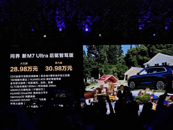 问界 M7 Ultra 提供了两个配置,四个价位,分别是后驱的五座版 28.98 万、六座版 30.98 万,还有四驱的五座版 30.98 万、六座版 32.98 万。四个版本配置完全一样,就是座位数和驱动形式不同,大家看着选也挺清楚的。