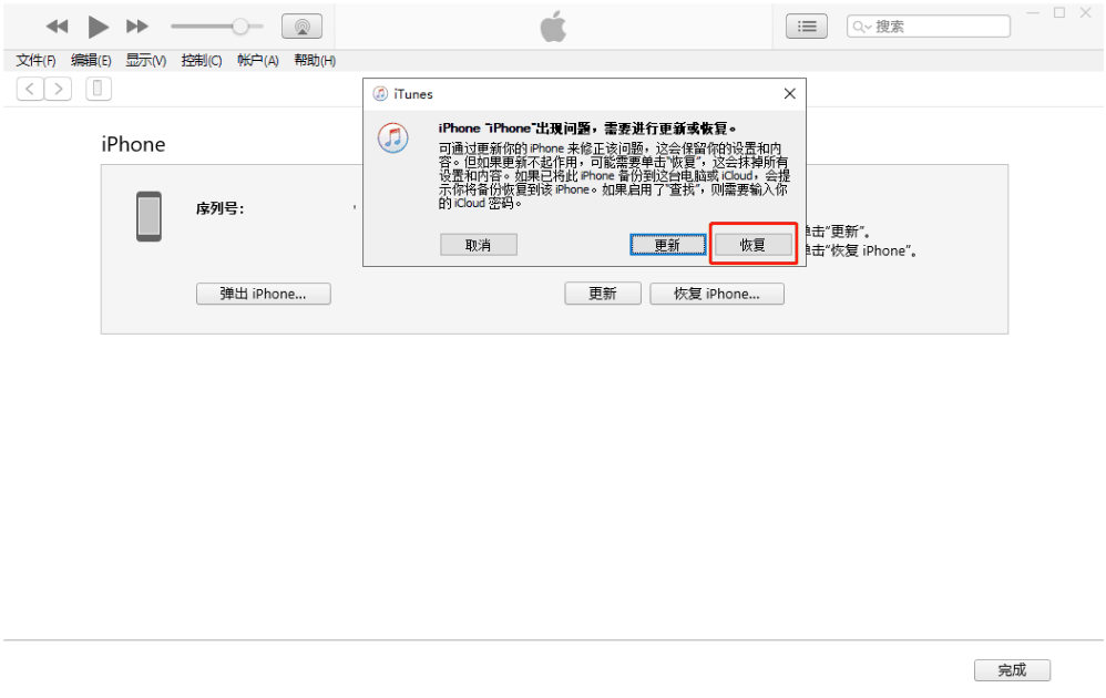 如果设备已经无法正常启动,那么我们可以尝试使用iTunes“恢复”功能进行修复,但请注意,这一操作会擦除设备上的所有数据,