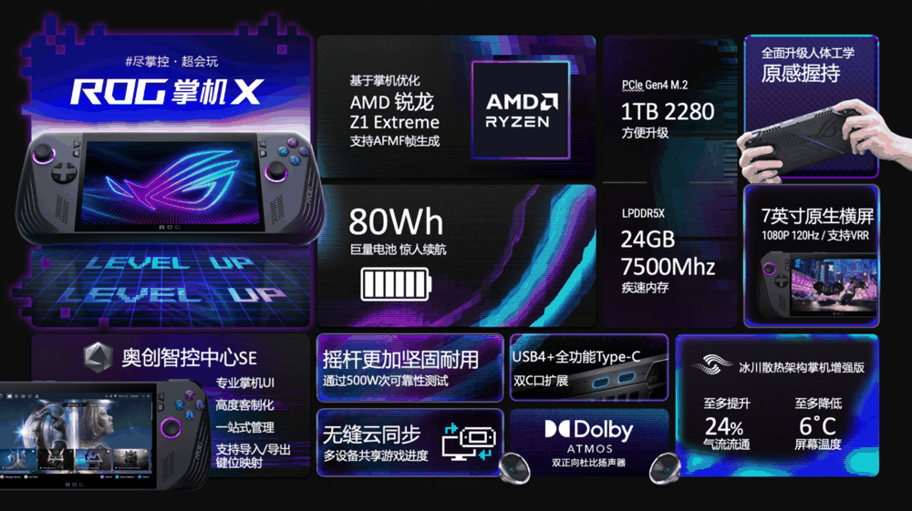 ROG掌机X也继承了前代7英寸1080P支持VRR的原生横屏和双正面杜比扬声器等传统优势,为玩家带来无与伦比的沉浸式游戏体验。