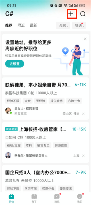 1、首先打开boss直聘软件,进入到首页中我们可以在要怎么的右上方看到有一个【加号图标】点击;