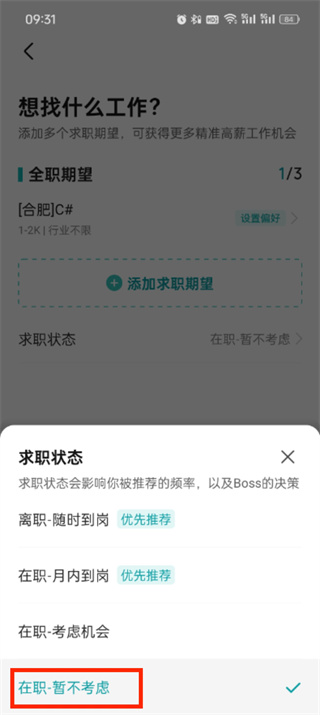 3、最后点击过后在页面下方会有离职-随时到岗、在职-月内到岗、在职-考虑机会和在职-暂不考虑,我们点击【在职-暂不考虑】即可;