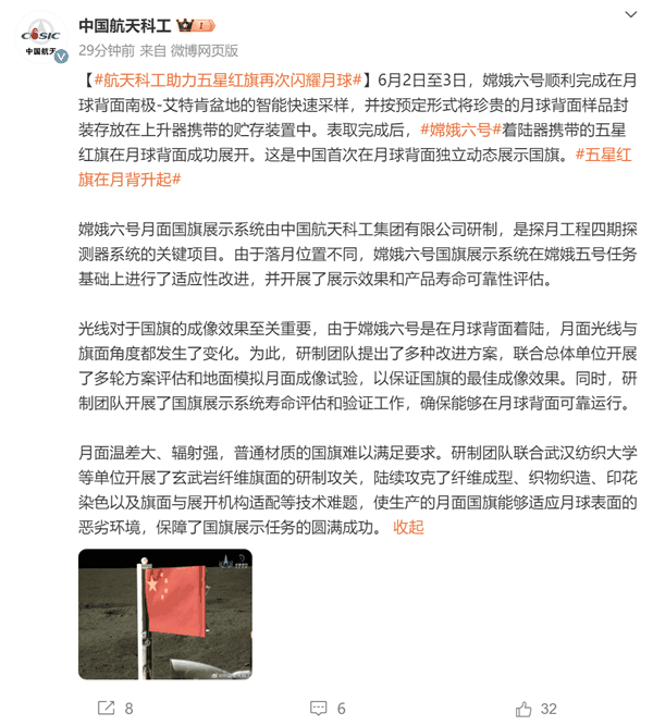 中国航天科工发文,对月背上升起五星红旗的制造材质,进行了科普。