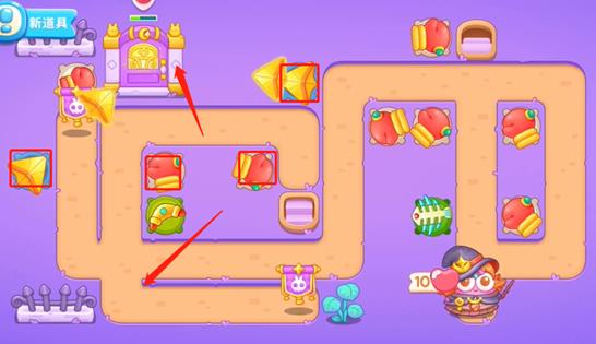 3、右边的道具全部清理掉后摆放鱼骨和拳套,然后往左边开图,清理道具和怪物,摆放炮塔。