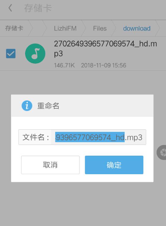 当从手机本地找到了音频文件之后,长按唤起功能列表,使用“重命名”功能将后缀名改为.MP3,这样就可以完成转换设置了。
