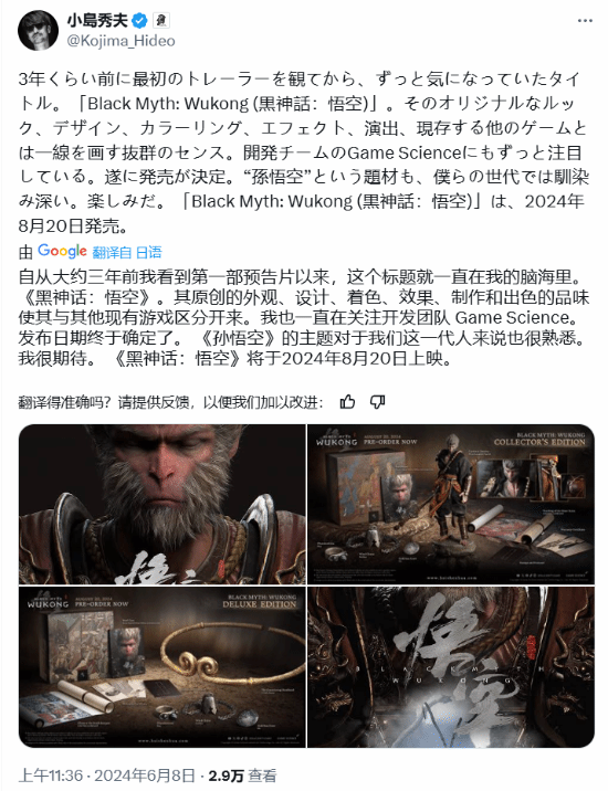 知名游戏制作人小岛秀夫也于今日发文,谈到了这款作品。