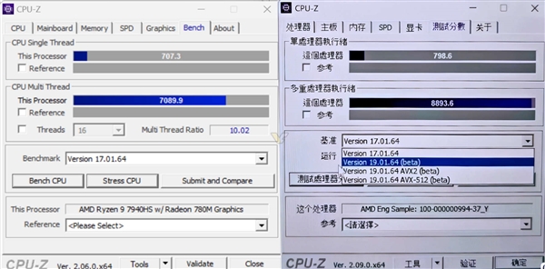 相对来说,CPU-Z已经不是AMD处理器的长项,但这一成绩依然超过了13/14代酷睿H系列,甚至可以打败i9系列。