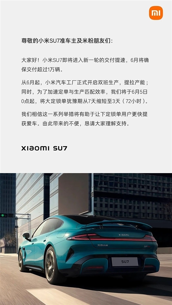 另外需要注意的是,小米为了加速定单与生产匹配效率,6月5日0点起已经将大定锁单犹豫期从7天缩短至3天(72小时),锁单的用户要注意时间。