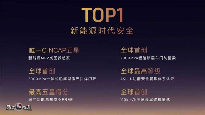 岚图为保障用户安全不断刷新标准,现已拥有领先行业的69项标准,还致力于打造全域安全,树立全球安全标杆。岚图不仅做到了行业唯一的MPV C-NCAP五星认证,还开创了众多全球领先的安全技术。如全球首创2000MPa一体式热成型激光拼焊门环,1500MPa的高强度钢底护板,还专门针对后排乘客安全通过了超美标时速110公里追尾后碰测试等。