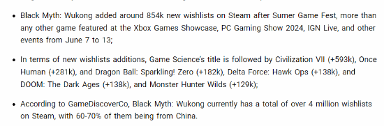 报告估算,《黑神话:悟空》愿望单收藏总量已超过400万,其中60%-70%的用户来自中国。