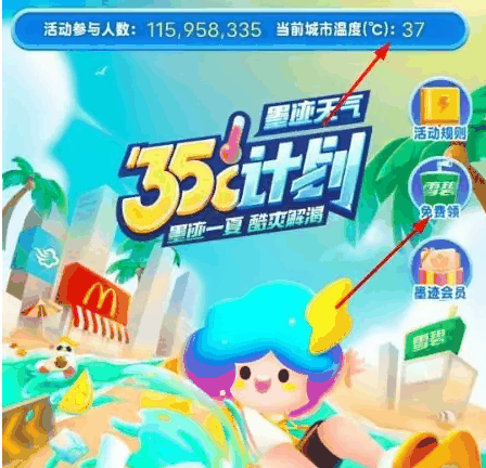 第三步我们就可以看到当地气温大于35度就可以单击【免费领】就可以领到二维码兑换免费雪碧了