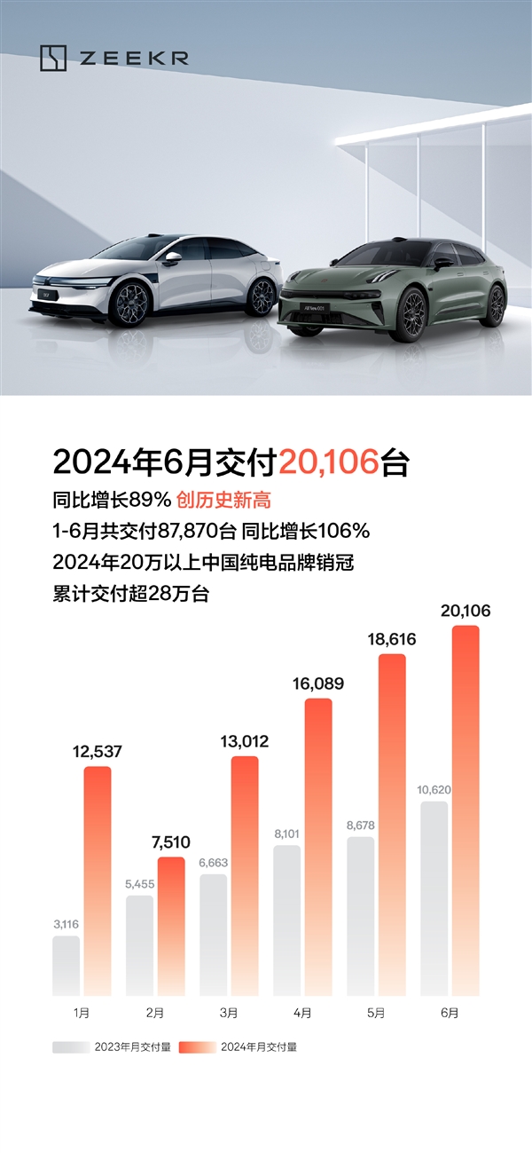极氪全系车辆6月交付20106台,同比暴增89%,月交付首度突破2万台,创极氪史上新高。
