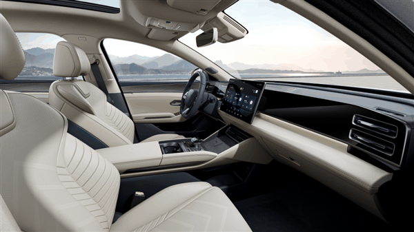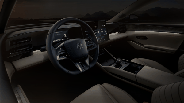 内饰设计非常惊艳,灵感来源于中国山水画,将东方山水的灵动与现代科技相融合,其最大的亮点在于使用了一体式中控台,液晶仪表、云窗扇叶空调出风口等均融合在一块卷轴长屏上,营造环抱感。