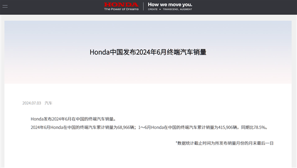 今年3月份本田在华新车销量大幅下滑了26.3%,创下了自2023年7月以来的最大同比降幅纪录,不过6月份的同比下滑扩大到39%,则创下新的记录。