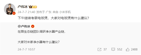 叮当号7月8日消息,卢伟冰昨天对小米生态链的净水器、电饭煲等进行了考察,并询问了网友的建议。