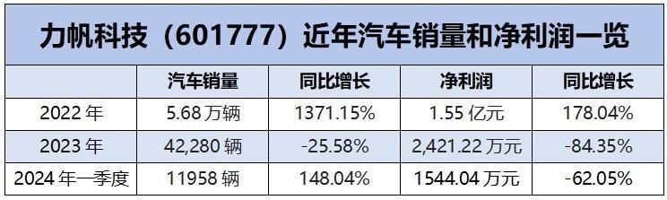 2022年,力帆取得了飘红的业绩:汽车销量5.68万辆,同比狂增13.7倍,净利润也增长178%至1.55亿元。但好景不长,仅仅红了一年的业绩很快开始回落,2023年,力帆汽车销量下降25.6%,净利润也暴跌84%,2024年一季度销量虽然大幅增长148%,但净利润却下降了62%。