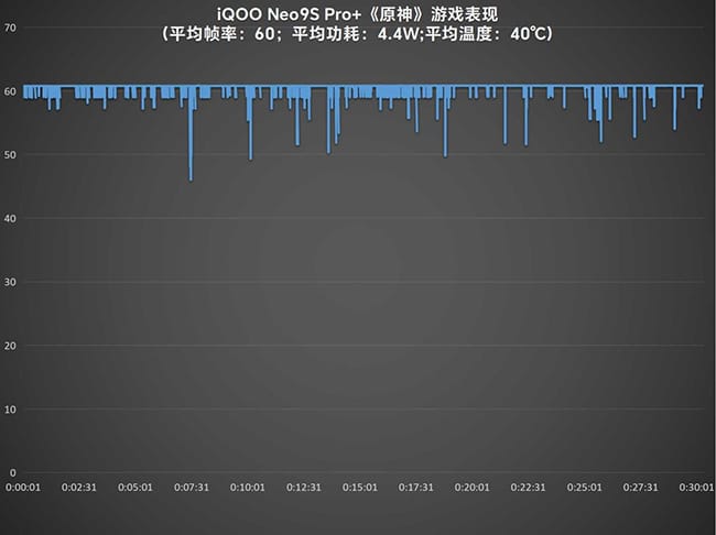 接下来是更高负载的《原神》,还是将游戏特效拉满,手动开启60帧,半个小时平均帧率60帧,平均功耗4.4W,机身背面最高温度也仅为40℃。