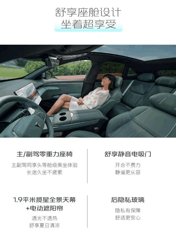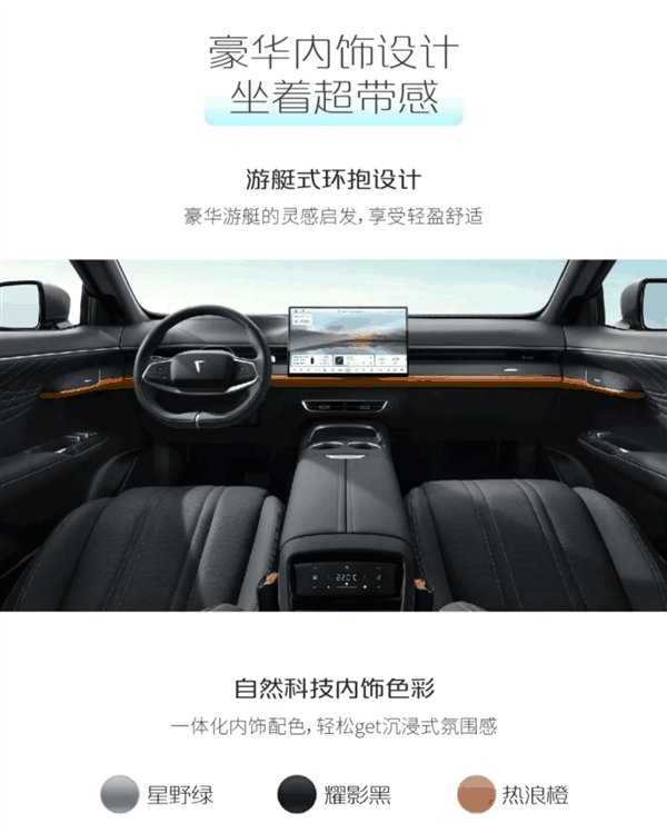 车内为“游艇式环抱设计”,主/副驾均为零重力座椅,配备15.6英寸2.5K分辨率智能车机,拥有55英寸AR-HUD全息式增强显示系统,整车配有14扬声器环绕音响,副驾提供12.3英寸智慧屏。