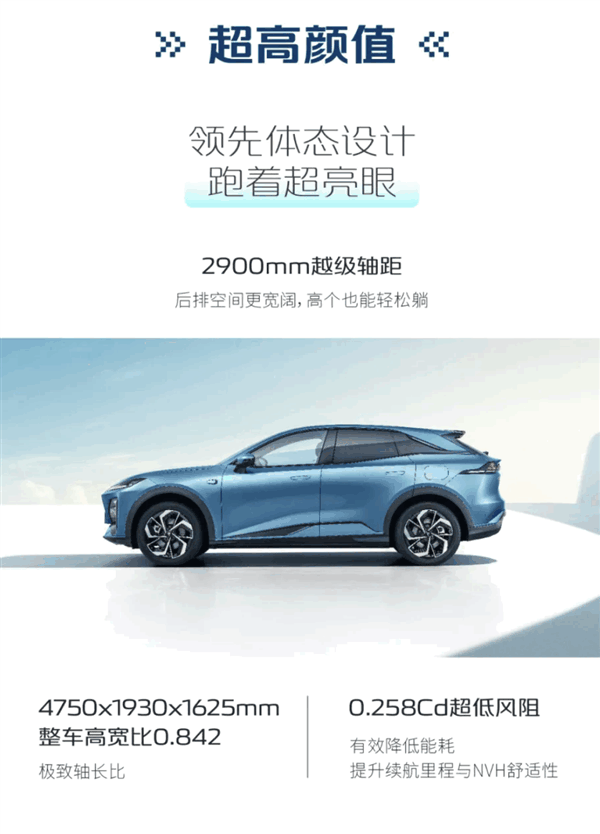 车身尺寸为4750 x 1930×1625mm,轴距2900mm,搭载无边框车门和隐藏式门把手。