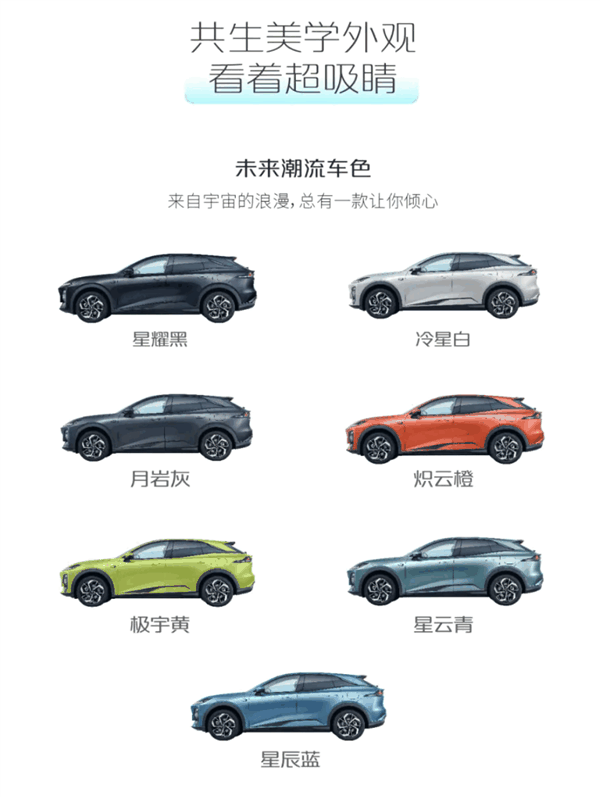 新车提供星耀黑、冷星白、月岩灰、炽云橙、极宇黄、星云青、星辰蓝七款车身色,前脸与深蓝家族保持一致。