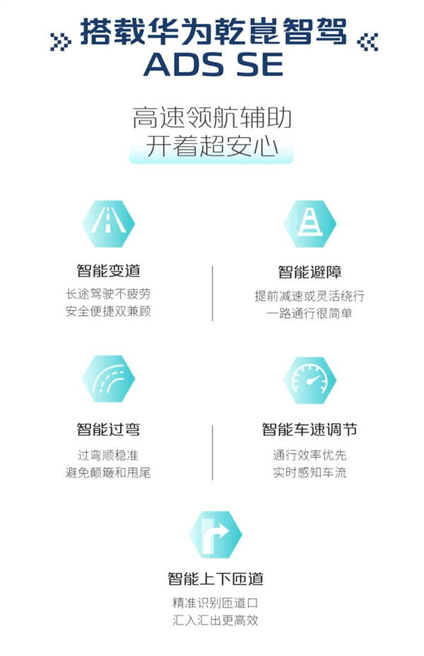 智驾方面,深蓝S07搭载华为乾崑智驾ADSSE,支持高速领航辅助功能,可实现智能变道、智能避障、智能过弯、智能车速调节、智能上下匝道等。