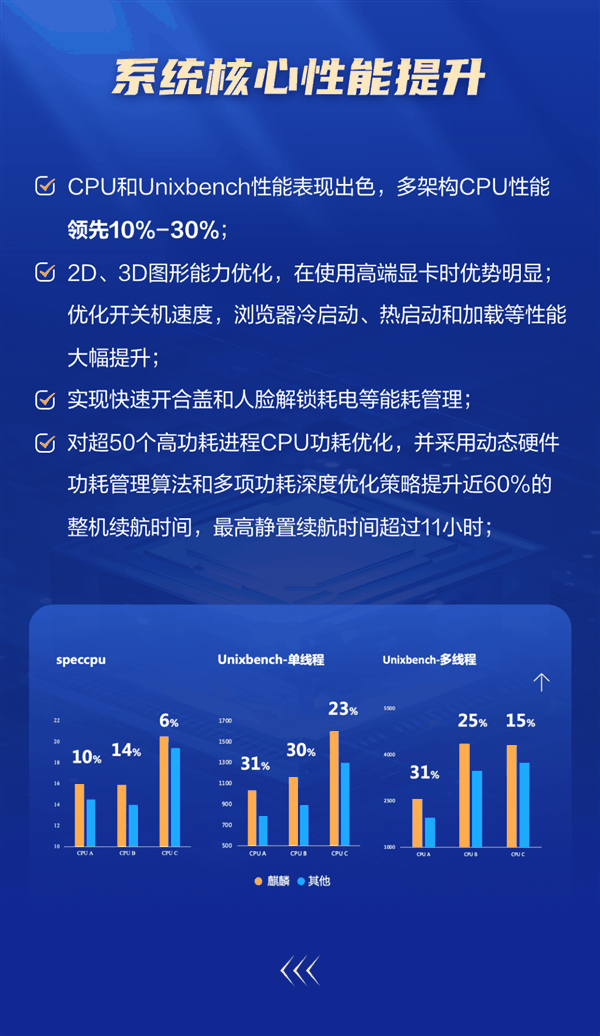 同时优化2D、3D图形能力,在使用高端显卡时优势明显:优化开关机速度,浏览器冷启动、热启动和加载等性能大幅提升等。
