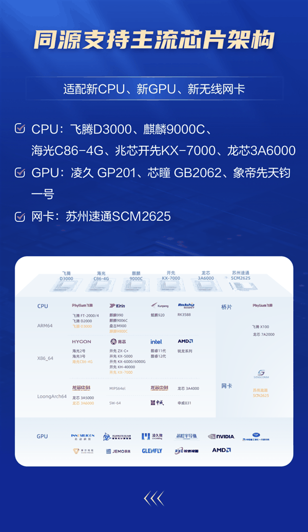 GPU适配:凌久GP201、芯瞳GB2062、象帝先天钧一号;