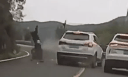 一名摩托车骑手在正常行驶时,不幸被一辆逆行的轿车撞飞,导致其在空中旋转后落地,摩托车的车头也在撞击中被撞掉。