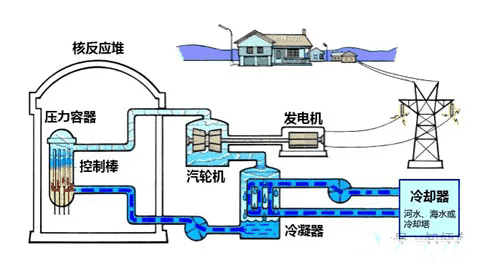 简单点来说,核电站中,反应堆的作用是进行核裂变,将核能转化为水的热能。水作为冷却剂在反应堆中吸收核裂变产生的热能,成为高温高压的水然后沿管道进入蒸汽发生器,产生蒸汽,蒸汽推动汽轮机,然后带动发电机发电。虽然有部分核电站可以利用氦气代替水蒸气,但目前来说,烧开水还是主流,而且用氦气和用水的原理没多大区别,都是充当一个冷却剂。